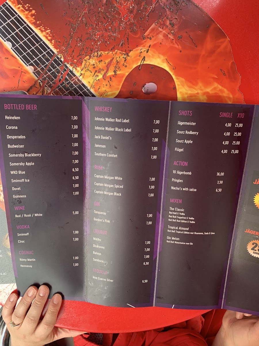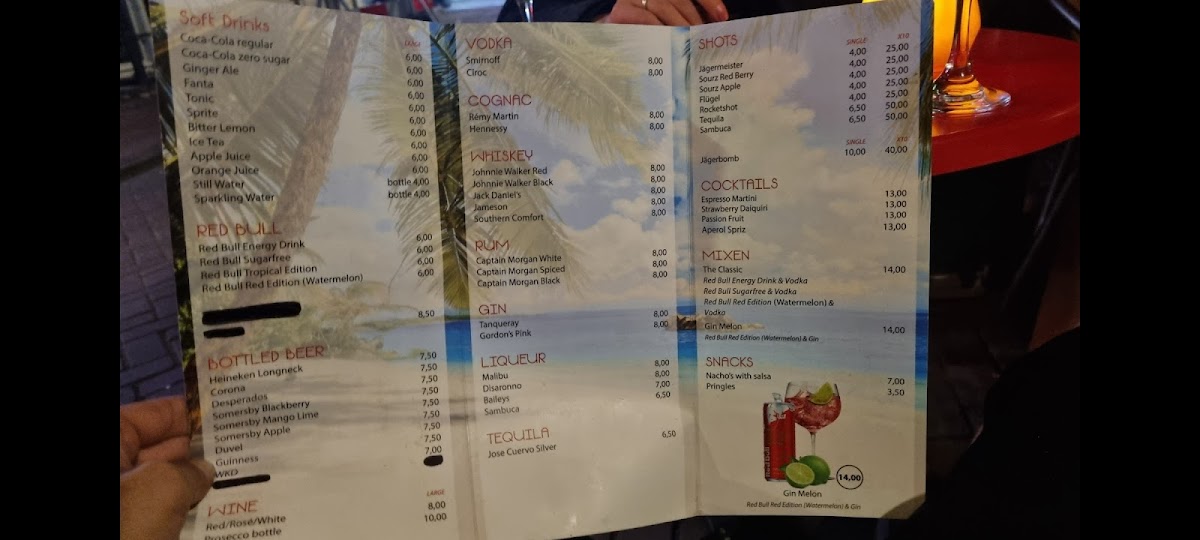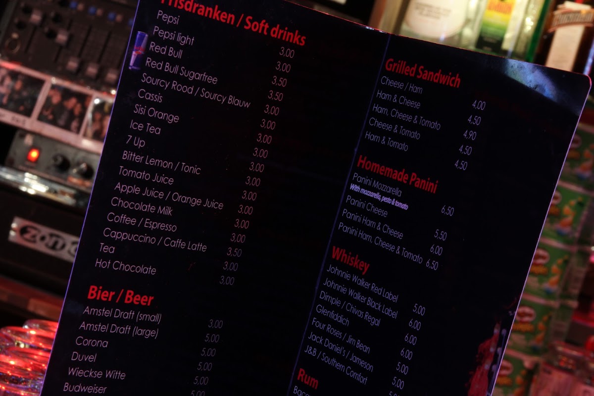 The menu offers a variety of beverages and light food options suitable for casual visits. Drink selections include several types of beer such as Grolsch, Heineken, Corona, and Leffe Rubia, as well as non-alcoholic choices like cola and Early Grey tea. Food options feature light meals including omelets.